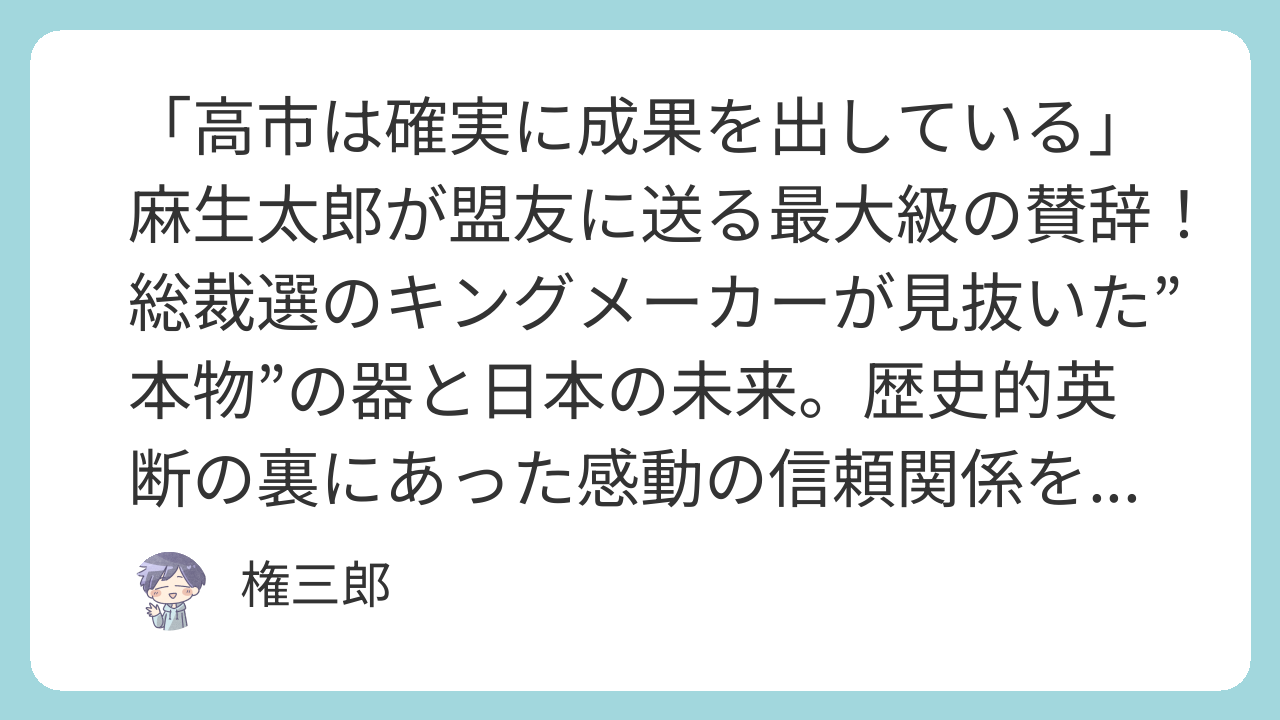 麻生さん、あなたが日本の転換期に、民意に耳を傾けてくれたことに、心から感謝します。そして、高市総理を支え、日本の未来が明るくなるよう、これからもその力を貸してください。私たち国民は、この歴史的なタッグが日本の未来を切り拓いてくれることを固く信じ、熱いエールを送り続けます。