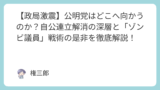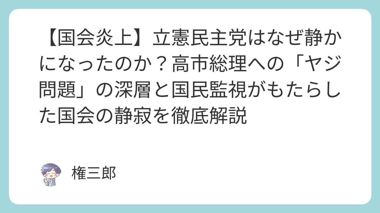 • 国民の監視がもたらした「静寂」: 炎上の結果、代表質問の場で立憲民主党は一転して沈黙を守りました。これは、インターネット中継やSNSを通じて国会を監視する「国民の目」が、議員の行動を律する強力な圧力となったことを示しています。