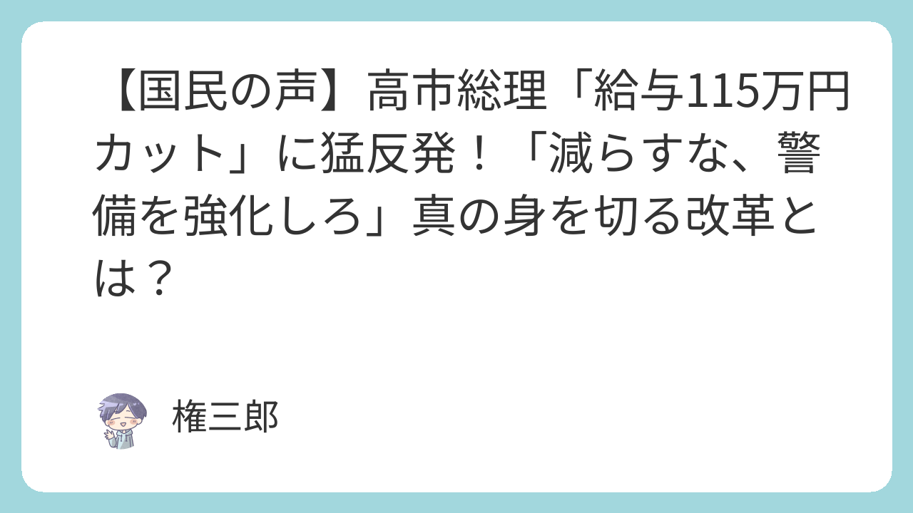 【国民の声】高市総理「給与115万円カット」に猛反発!「減らすな、警備を強化しろ」真の身を切る改革とは?