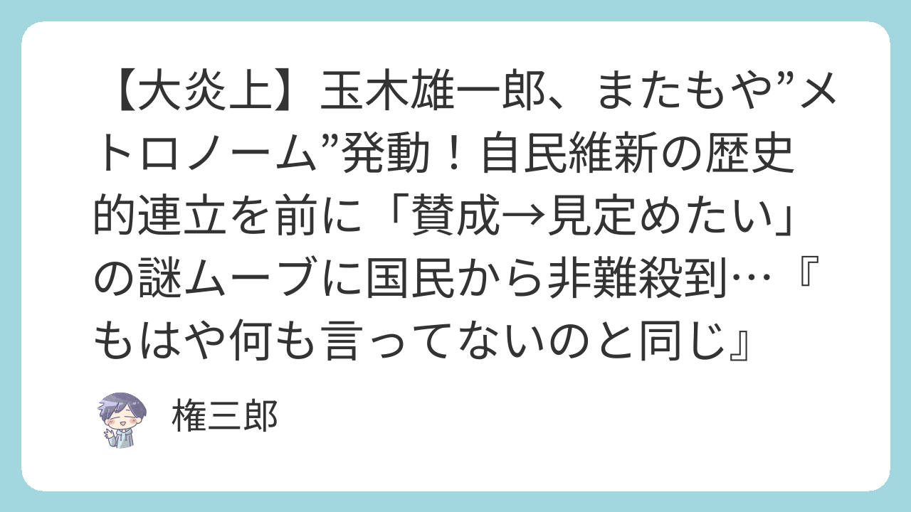 かつて「自民・維新が本気なら賛成する」と高らかに宣言した政策について、いざ両党が合意に至るや否や、突如として「見定めたい」と慎重姿勢に転換。そのあまりにも見事な手のひら返しは、左右に揺れ続ける振り子のごとく、もはや彼の代名詞となった「メトロノーム」と揶揄され、ネット上で大炎上している。