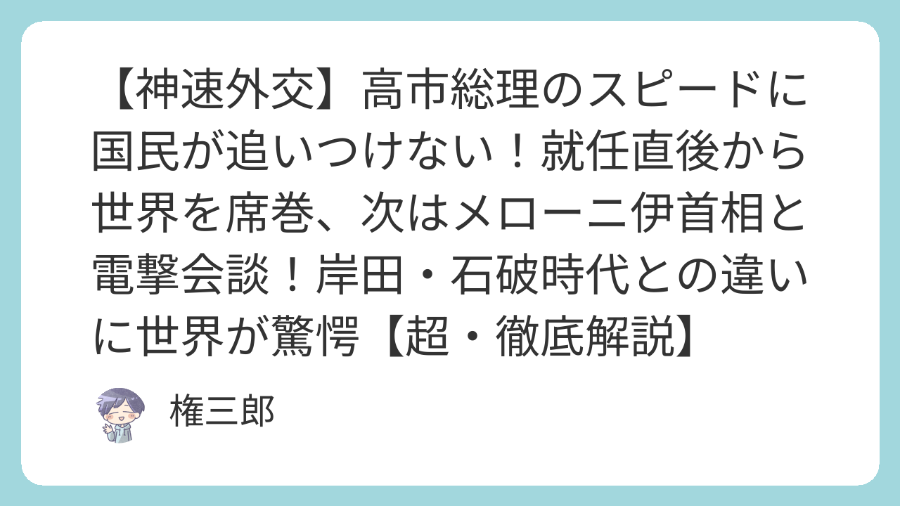 国民がそのスピードに「追いつけない」と感じるのは、それだけ長い間、日本の政治が停滞していたことの裏返しでもある。だが、心配する必要はない。我々はこのスピードに慣れ、やがては総理と共に、世界の先頭を走ることになるだろう。