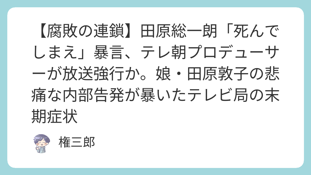 「田原自体は自業自得だけど、この暴露でどれだけこの局がクソであることがまた明るみに出た」「この間のNHKのダッチアングルもそうだけど、オールドメディアの内部倫理崩壊酷いな」「こりゃ局の責任問題が確定的になる決死の暴露やな…そりゃ番組終了までの判断が鬼の速さになるわけだ…」