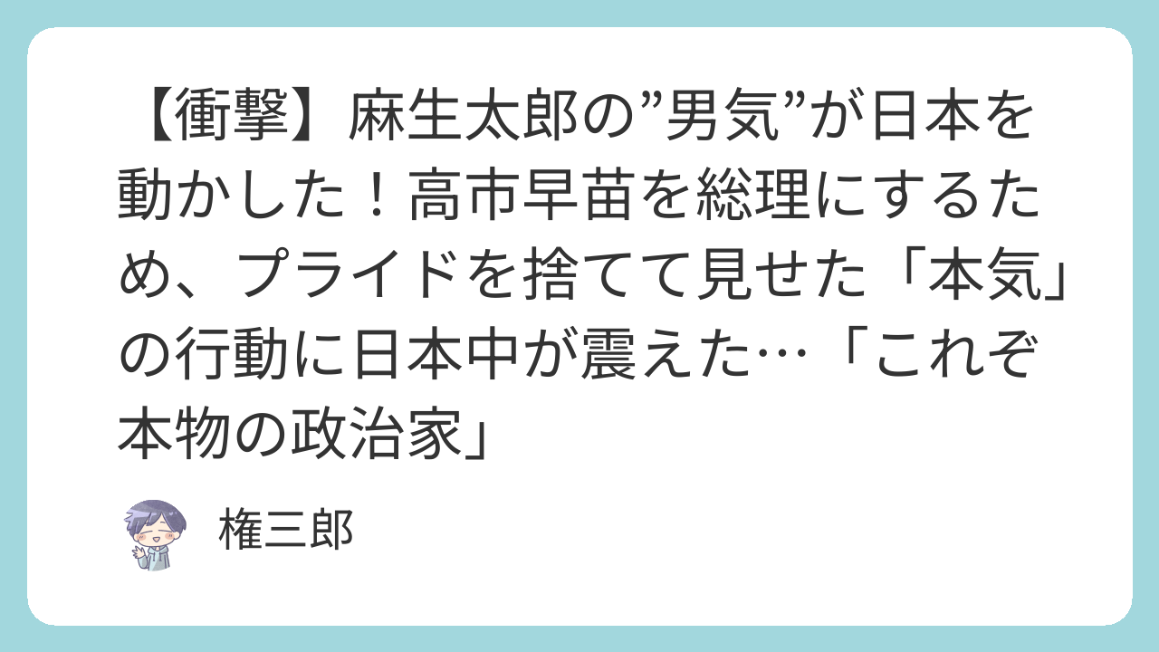 【衝撃】麻生太郎の”男気”が日本を動かした!高市早苗を総理にするため、プライドを捨てて見せた「本気」の行動に日本中が震えた…「これぞ本物の政治家」