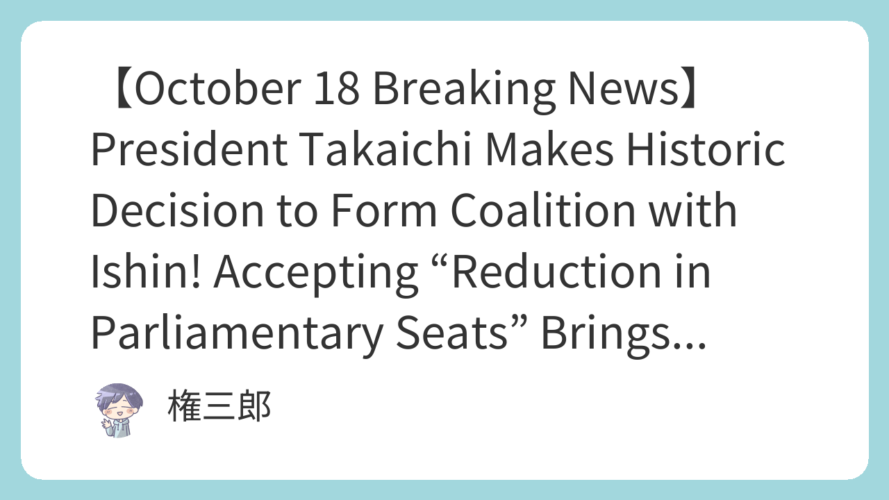 A seismic shock, heralding a tectonic shift, has rocked Nagatacho. On October 17, 2025, the Liberal Democratic Party (LDP), led by President Sanae Takaichi, and the Japan Innovation Party (Nippon Ishin no Kai), led by co-leader Fumitake Fujita, held their second round of policy talks within the Diet to form a coalition government. Negotiations between the two parties had been cautious and fraught with tension, but on this day, Japan’s political history took a momentous turn. President Takaichi announced a chilling, emergency decision: she would accept the direction of the “reduction in the number of Diet member seats,” a non-negotiable “absolute condition” that Ishin had put forward for the coalition.