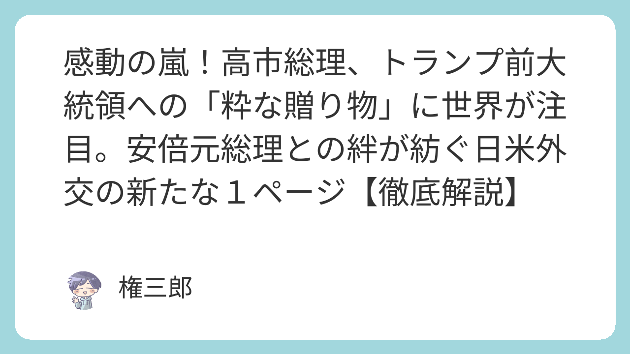 高市総理がトランプ前大統領に贈ろうとしている安倍元総理の形見は、単なる外交儀礼を超えた、心と心を結ぶ架け橋です。それは、友情が国家間の関係をいかに豊かで強固なものにするかを示す、感動的な実例となるでしょう。