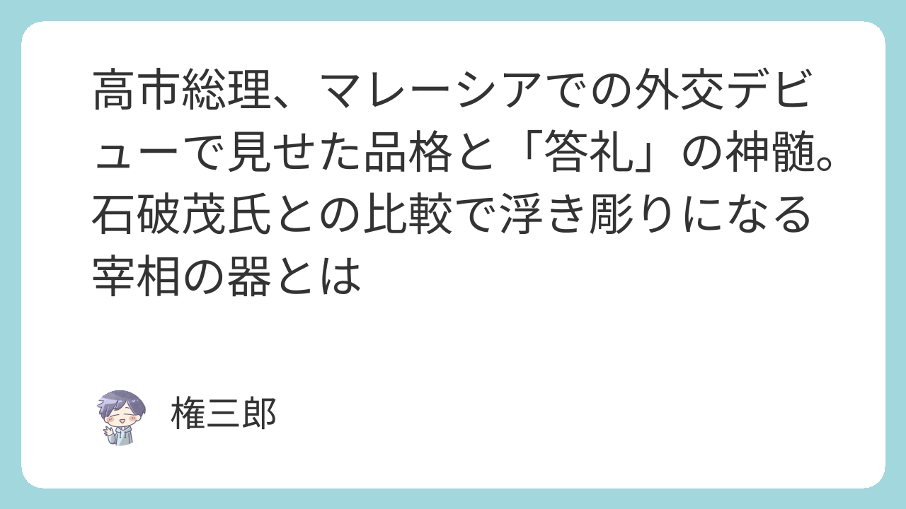 私たちは、国の代表である総理大臣の一挙手一投足が、いかに重要であるかを、この鮮やかな対比を通して改めて学びました。高市総理には、今後もその卓越したバランス感覚と品格をもって、日本の国益を守り、国際社会における名誉を高めていってくれることを、心から期待したいと思います。国民が誇れる総理の誕生を、今、私たちは目の当たりにしているのかもしれません。