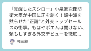 「覚醒したスシロー」小泉進次郎防衛大臣が中国に牙を剥く!媚中派を黙らせた”正論”と外交トップセールスの衝撃。もはやポエムは聞けない、頼もしすぎる外交デビューを徹底分析!