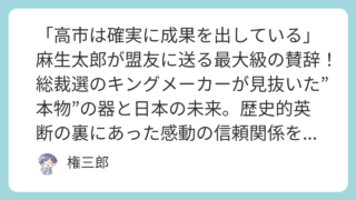 「高市は確実に成果を出している」麻生太郎が盟友に送る最大級の賛辞!総裁選のキングメーカーが見抜いた”本物”の器と日本の未来。歴史的英断の裏にあった感動の信頼関係を徹底分析!