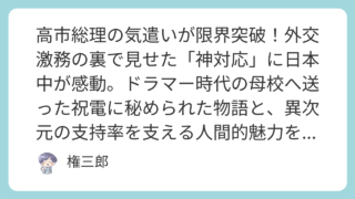高市総理の気遣いが限界突破!外交激務の裏で見せた「神対応」に日本中が感動。ドラマー時代の母校へ送った祝電に秘められた物語と、異次元の支持率を支える人間的魅力を徹底解剖!