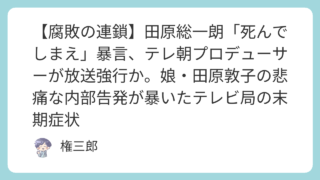 【腐敗の連鎖】田原総一朗「死んでしまえ」暴言、テレ朝プロデューサーが放送強行か。娘・田原敦子の悲痛な内部告発が暴いたテレビ局の末期症状