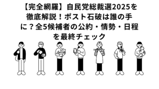 政治【完全網羅】自民党総裁選2025を徹底解説!ポスト石破は誰の手に?全5候補者の公約・情勢・日程を最終チェック 2025年9月22日に告示された自由民主党総裁選挙は、10月4日の投開票日に向けていよいよ最終盤を迎えています。 現職の石破茂総理大臣が任期途中での辞任を表明したことに伴い、日本の次期リーダーを決めるこの選挙は、まさに国の未来を左右する重要... 2025.10.03政治