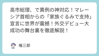 政治高市総理、で異例の神対応!マレーシア首相からの「家族ぐるみで支持」宣言に世界が震撼!外交デビュー大成功の舞台裏を徹底解説!